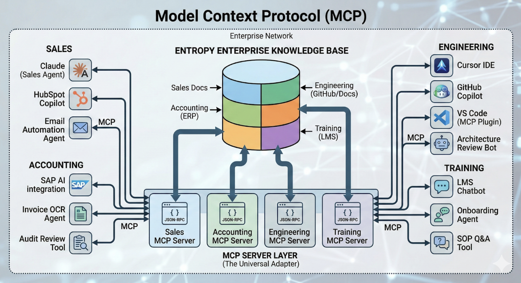 The knowledge base is accessible by any AI tool within the organization, usually via an MCP server (see our piece on the hidden benefit of MCP). It provides the grounding layer for your company's AI — giving every model and agent context about how your business operates and how it interacts with clients and the market.